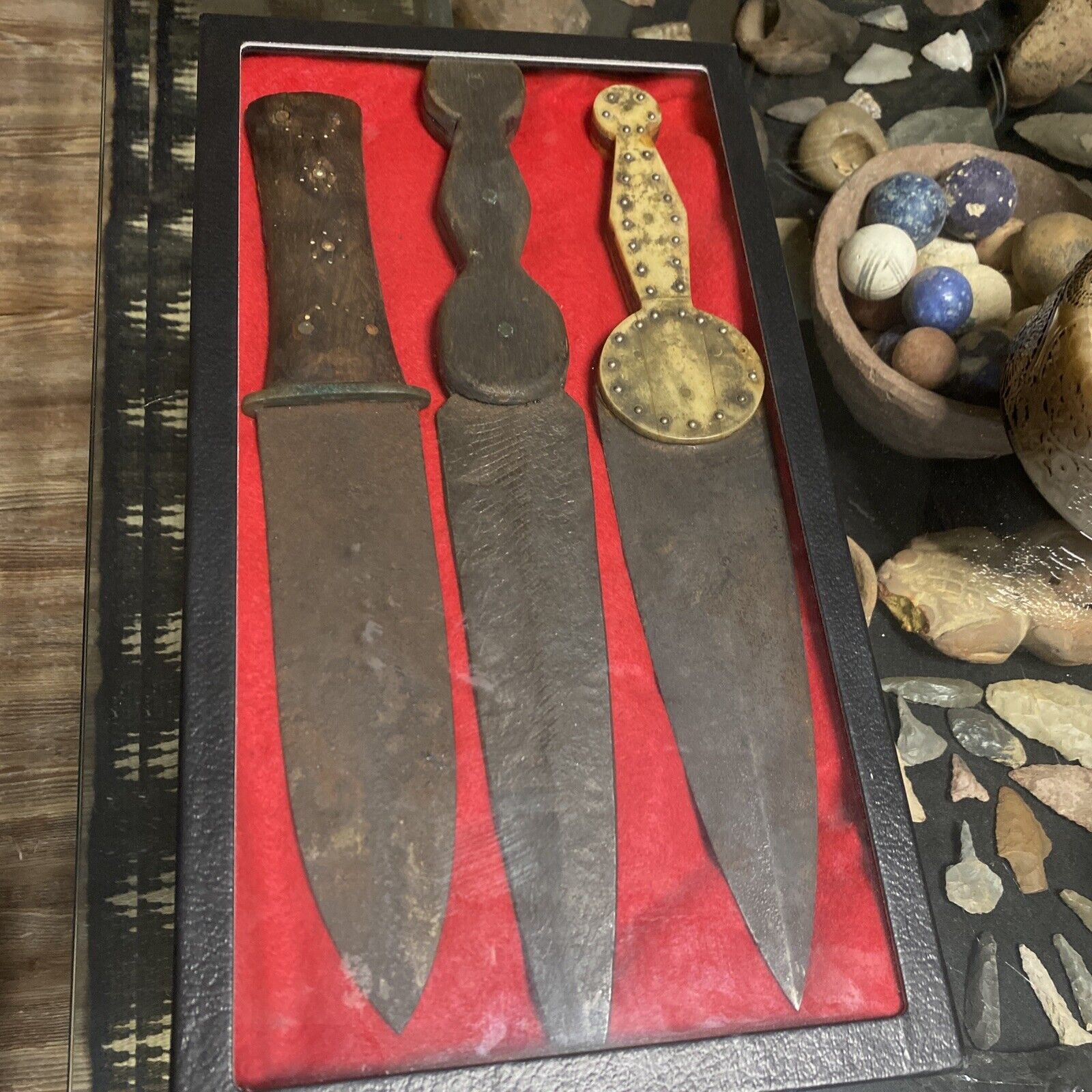 THIS IS A PRIMITIVE HANDMADE INDIAN TRADE KNIFE PATTERNED AFTER AN OLD INDIAN MADE EXAMPLE. A HAND FORGED BLADE WITH A RIVETED HARDWOOD HANDLE AND DECORATIVE BRASS PINS. A FINE 7″ BLADE WITH OVERALL LENGTH APPROX. 12″. A GREAT ADDITION TO YOUR OUTFIT. SHEATH INCLUDED.